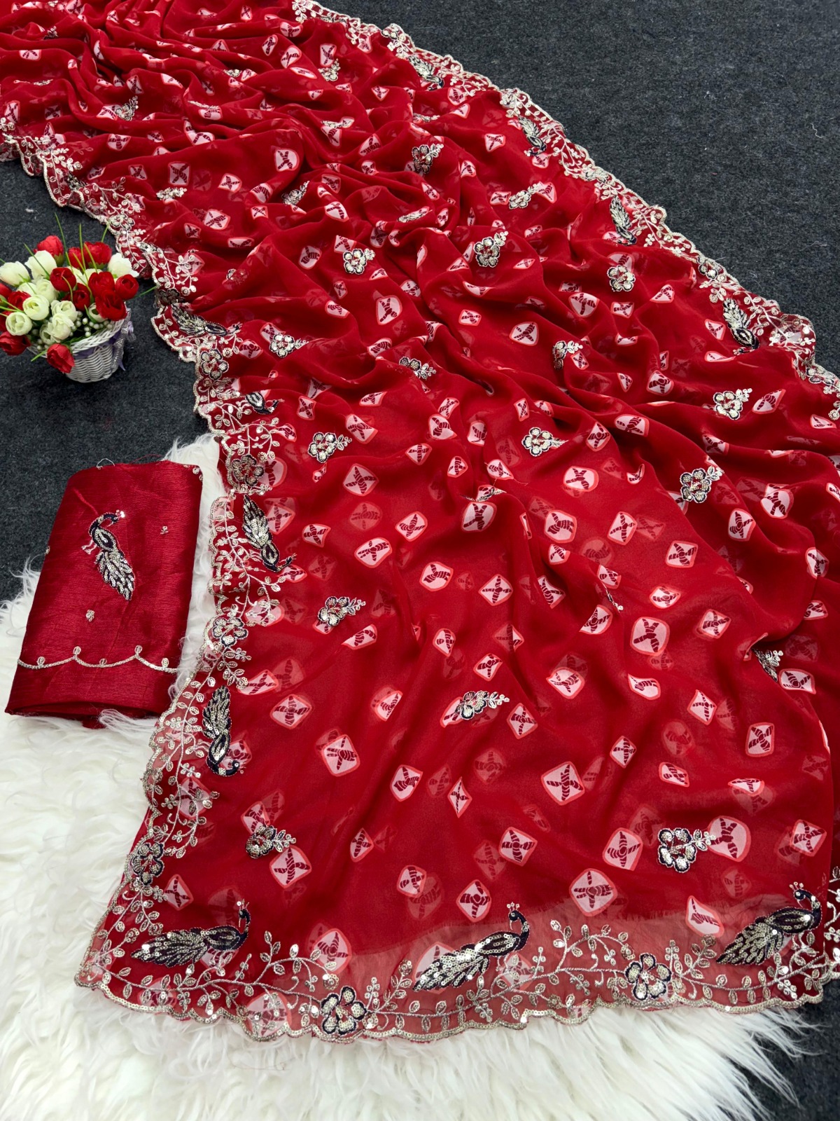 SAREE FABRIC CHINON SILK STAR GEORGETTE JIMMY CHU CRUNCHY CHIFFON AND GEORGETTE BANDHANI PRINT AND KASMIRI COTTON WITH BLOUSE ALL DESIGN HEAVY MULTI AND SEQUANCE C PALLU WORK DONE