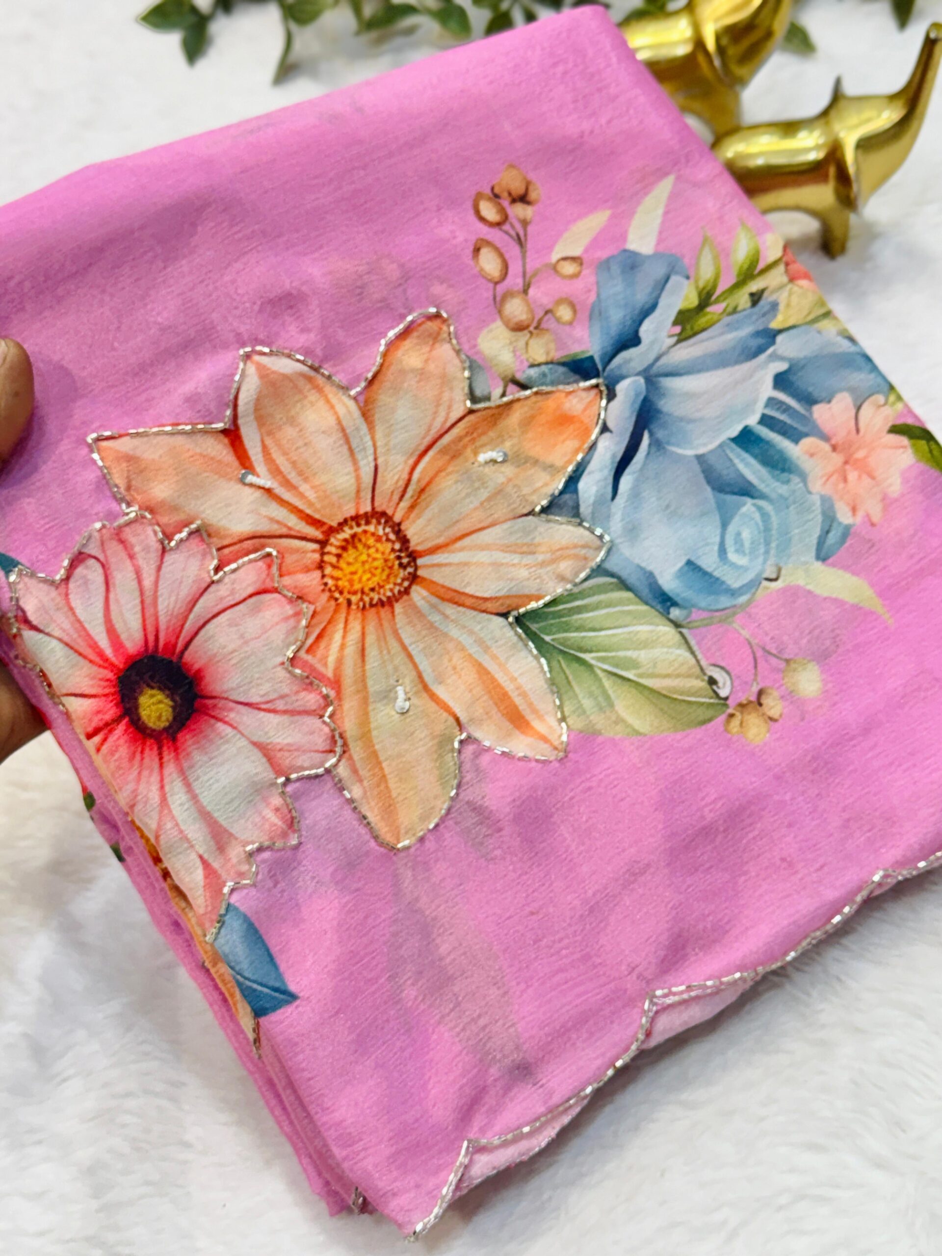 Fabric – Soft Chinon silk saree floral digital print with beautiful handwork and hand work with cut-work border